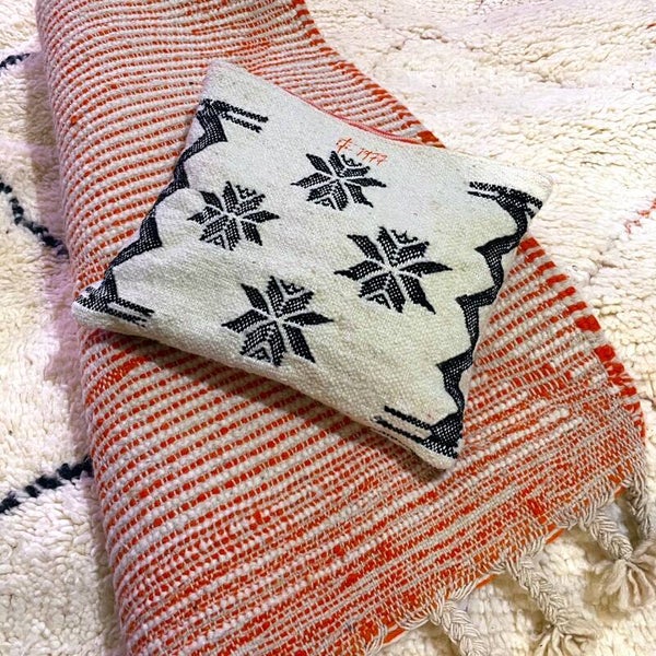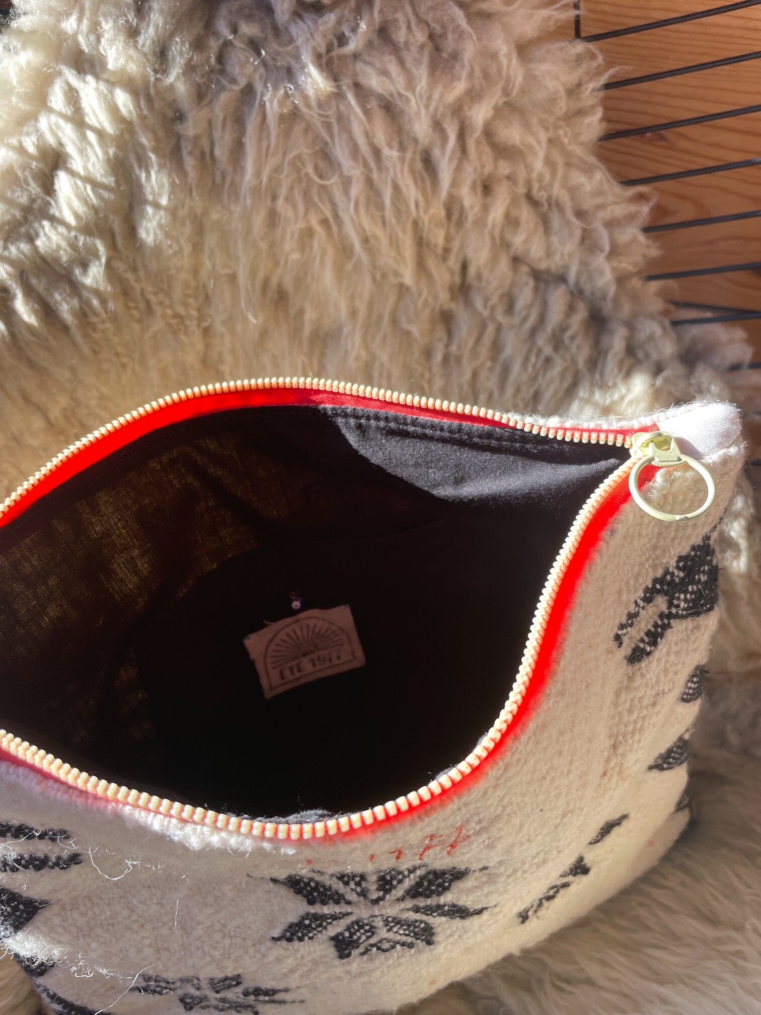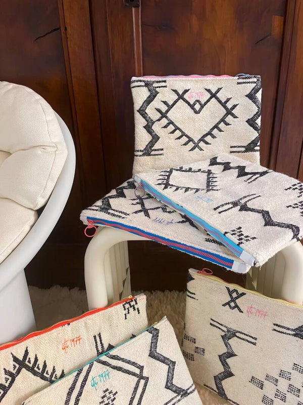 Chaque pochette est confectionnée à partir de tapis en laine de mouton tissés à la main par les femmes berbères des montagnes de l’Atlas Marocain.