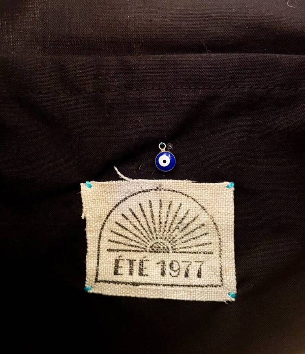 Pochette intérieure avec notre étiquette Été 1977 apposée (en lin ancien) et détail "oeil protecteur" en métal